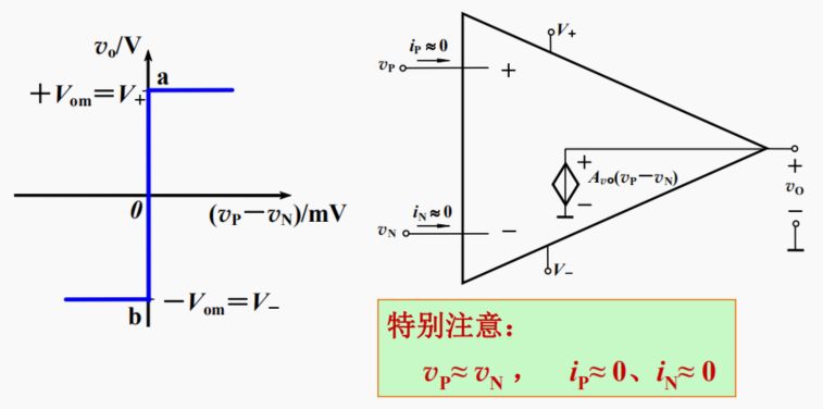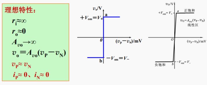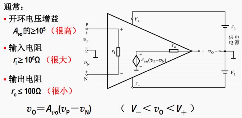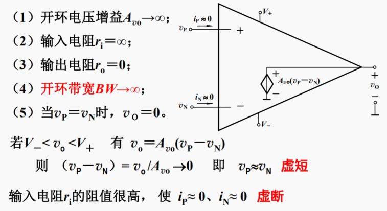 ● 理想的運(yùn)算放大器具有無(wú)窮大的開環(huán)增益,無(wú)窮大的輸入電阻和 0 輸出電阻,即:Avo→∞,ri→∞, ro=0。