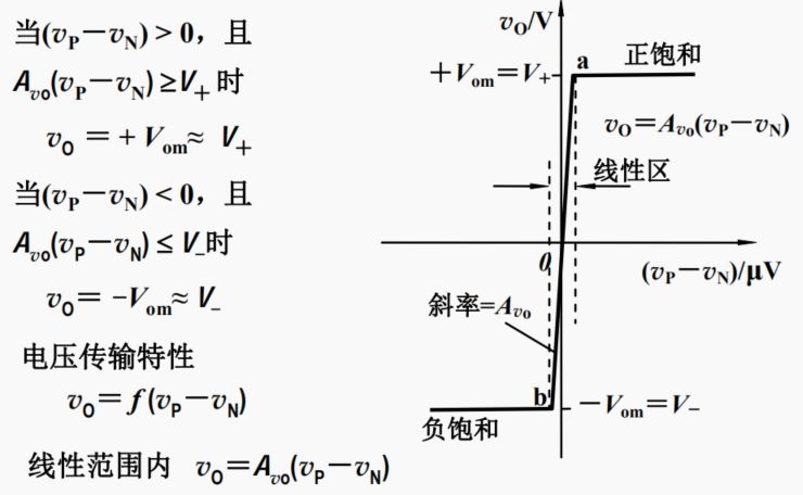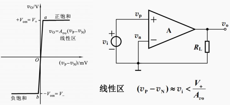 ● 運(yùn)算放大器有兩個(gè)工作區(qū),線性區(qū)和非線性區(qū)。 在線性區(qū),其放大同相輸入端與反相輸入端之間的差值信號(hào)(vP-vN)。 運(yùn)算放大器開環(huán)(無(wú)負(fù)反饋)工作時(shí),很容易進(jìn)入非線性區(qū),輸出電壓接近電源電壓。