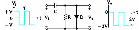 Vi正半周時(shí),二極管DON,C被充電至V值(左正、右負(fù)),Vo=+V1(a)圖或-V1(b)圖。