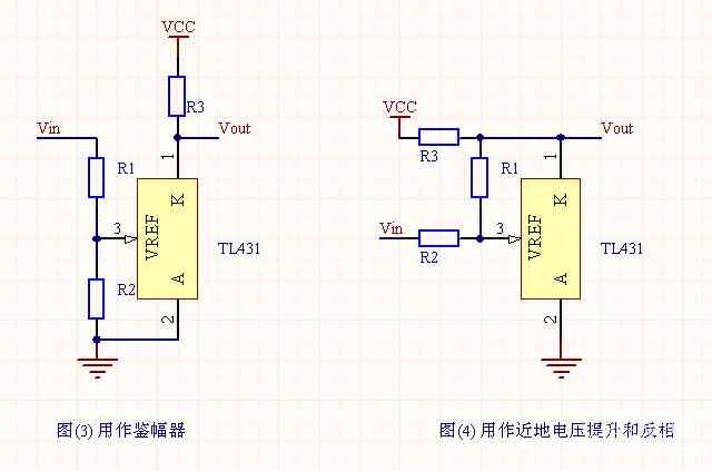 利用TL431還可以組成鑒幅器,如圖(3),這個(gè)電路在輸入電壓 Vin < (R1+R2)*2.5/R2 的時(shí)候輸出Vout為高電平,反之輸出接近2V的電平。需要注意的是當(dāng)Vin在(R1+R2)*2.5/R2附近以微小幅度波動(dòng)的時(shí)候,電路會(huì)輸出不穩(wěn)定的值。