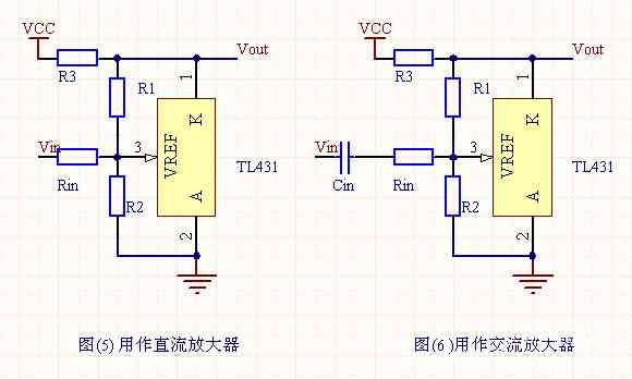 圖(5)顯示了一個(gè)用TL431組成的直流電壓放大器,這個(gè)電路的放大倍數(shù)由R1和Rin決定,相當(dāng)于運(yùn)放的負(fù)反饋回路,而其靜態(tài)輸出電壓由R1和R2決定。