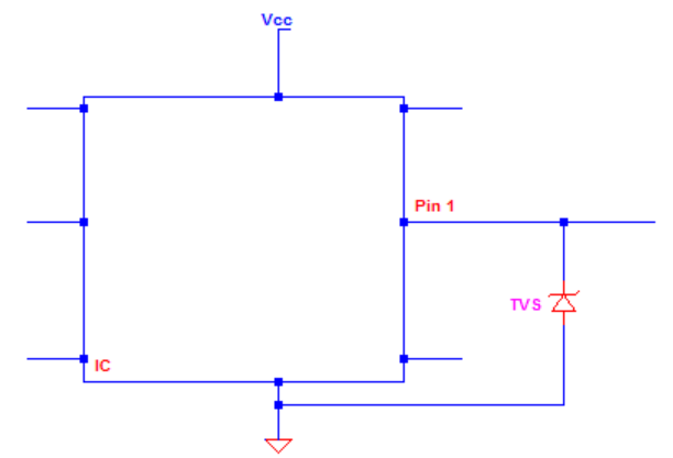 IC引腳旁邊的單向TVS。在電路正常運(yùn)行時(shí),TVS 不導(dǎo)通。當(dāng)有正尖峰時(shí),電壓會(huì)被鉗位。當(dāng)出現(xiàn)負(fù)尖峰時(shí),TVS將正向偏置并將尖峰轉(zhuǎn)向GND。