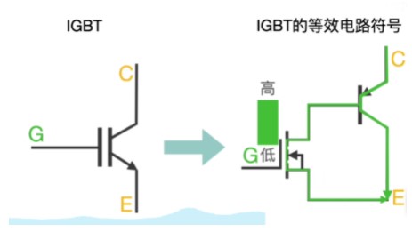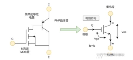 IGBT有N溝道型和P溝道型兩種,主流的N溝道IGBT的電路圖符號及其等效電路如下:
